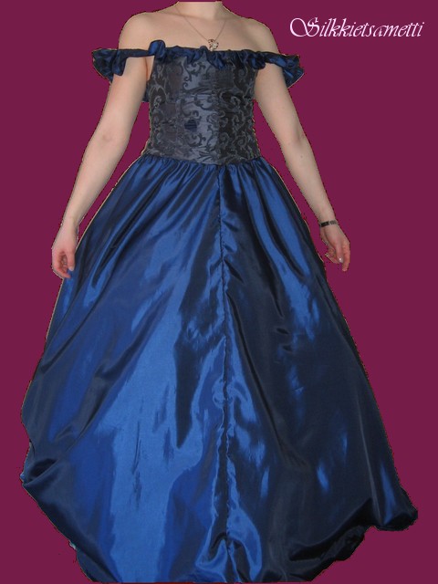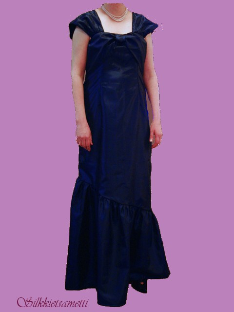Tämä puku on tehty pitkälle naiselle tohtorikaronkkaa varten. Helman vino rypytys ja yläosan rusetti katkaisevat puvun pituutta ja tuovat siihen elävyyttä. |