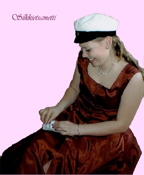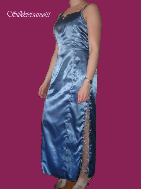 Kevään ylioppilas haluaa usein persoonallisen asun. Tämän kapean mekon halkiossa on koristeena hopeanväristä ketjua. |