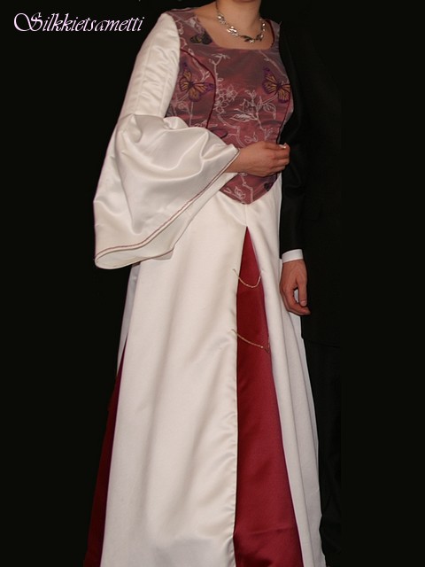 Morsian halusi persoonallisen ja itsensä näköisen asun. Tässä puvussa perinteinen valkoinen yhdistyy viininpunaiseen aina hihansuiden kirjontoja myöten. |