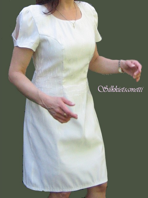 Myös ylioppilaan äidin pukuun kannattaa panostaa. Kankaan kirjontakuvio tulee esiin yksinkertaisten leikkausten ansiosta. |