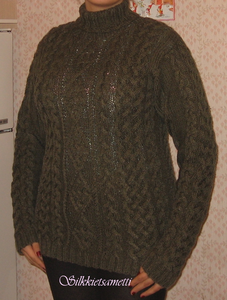 Tähän sammaleenvihreään neuleeseen on yhdistelty useita erilaisia palmikoita. Paksu villapusero lämmittää mukavasti talvipakkasilla ja kesäiltana nuotiolla. |